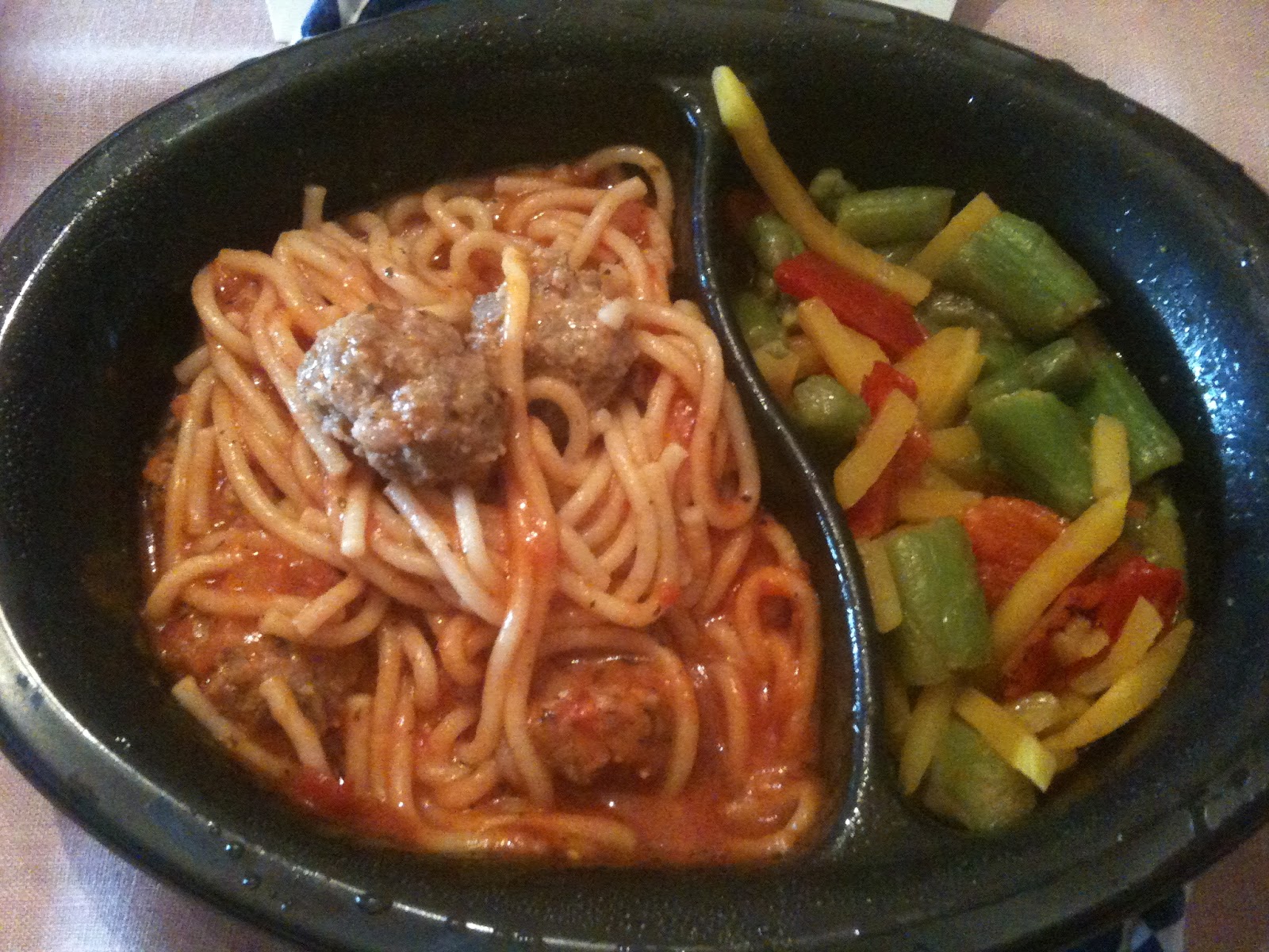 My workout felt long and lame, so I cut my jog short at about 2.60 miles. Tonight I think I'll carb load so I can go longer tomorrow. I opted for a frozen dinner of spaghetti and meatballs. It did not look like the photo.